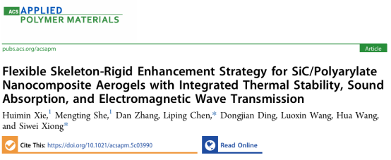 近期,我院王桦、王罗新教授团队本科生谢惠敏在材料科学领域权威期刊《ACS Applied Polymer Materials》(中科院二区)以第一作者发表了题为“Flexible Skeleton-Rigid Enhancement Strategy for SiC/Polyarylate Nanocomposite Aerogels with Integrated Thermal Stability, Sound Absorption, and Electromagnetic Wave Transmission ”的学术论文。必赢bwin官方网站必赢bwin网址大全为该论文的第一署名单位,熊思维副教授为论文的指导老师和通讯作者。