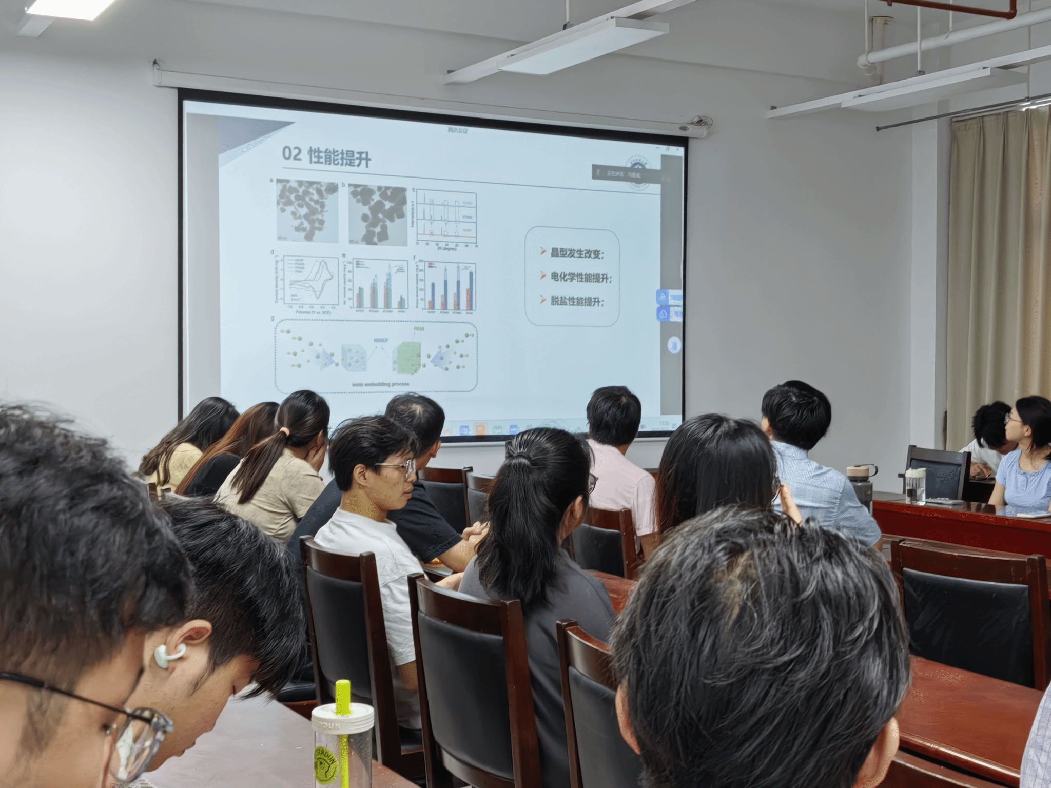 马亚成同学以《通过聚苯胺介导层的H₂O阻塞和活性位点增多促进框架材料中的双离子吸附》为题,提出了一种新型聚苯胺功能化策略,有效解决了传统框架材料在脱盐过程中因水分子共嵌入导致的结构不稳定与活性位点利用率低的问题。研究表明,聚苯胺层不仅增强了材料的疏水性,阻断水分子嵌入,还通过引入氮活性位点显著提升了离子扩散速率与电化学性能。该材料在电容去离子(FCDI)技术中表现出优异的双离子吸附能力,为海水淡化提供了高效、绿色的新路径。