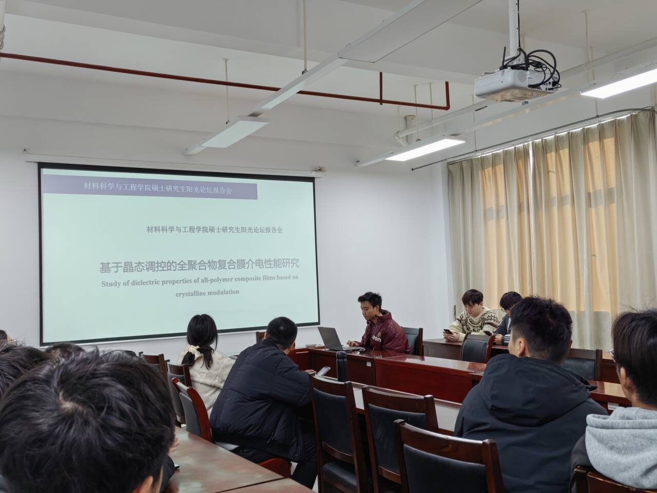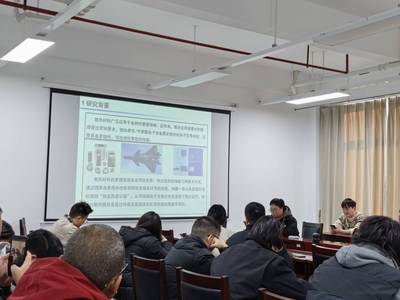 2025年11月20日,必赢bwin网址大全在必赢bwin网址大全12教309成功举办了2025年第25期研究生学术论坛。本次论坛由研究生院主办、必赢bwin网址大全承办,杜玮、朱雨璇两位教师担任轮值主持。学院硕士研究生杨浩东、肖雨豪、丁瑞、李旭四位同学围绕“新材料的创新与应用”主题,依次汇报了最新科研进展,集中展示了学院在介电性能研究、光热转换复合材料、静电植绒结构构筑、光催化TiO2/g-C3N4异质结改性等方向的前沿探索成果。