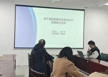 戚广营同学在唐清泉老师的指导下,汇报了《用于高效防除冰和发电的光热超疏水涂层》。研究团队通过喷涂与光交联工艺,制备出具有超疏水、高光吸收、防除冰与热电转换功能的复合涂层。该涂层在1个太阳光强下可实现快速融冰并同时输出电能,兼具表面保护与能源收集功能,在极端环境防护与可再生能源利用中具有广阔应用前景。